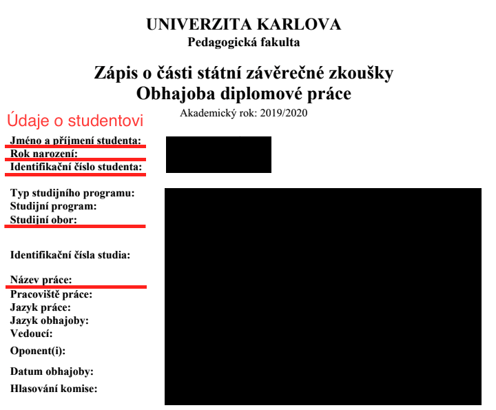 Většinu potřebných údajú a dokumentů (posudek vedoucího práce, posudek oponenta, protokol o průběhu obhajoby)